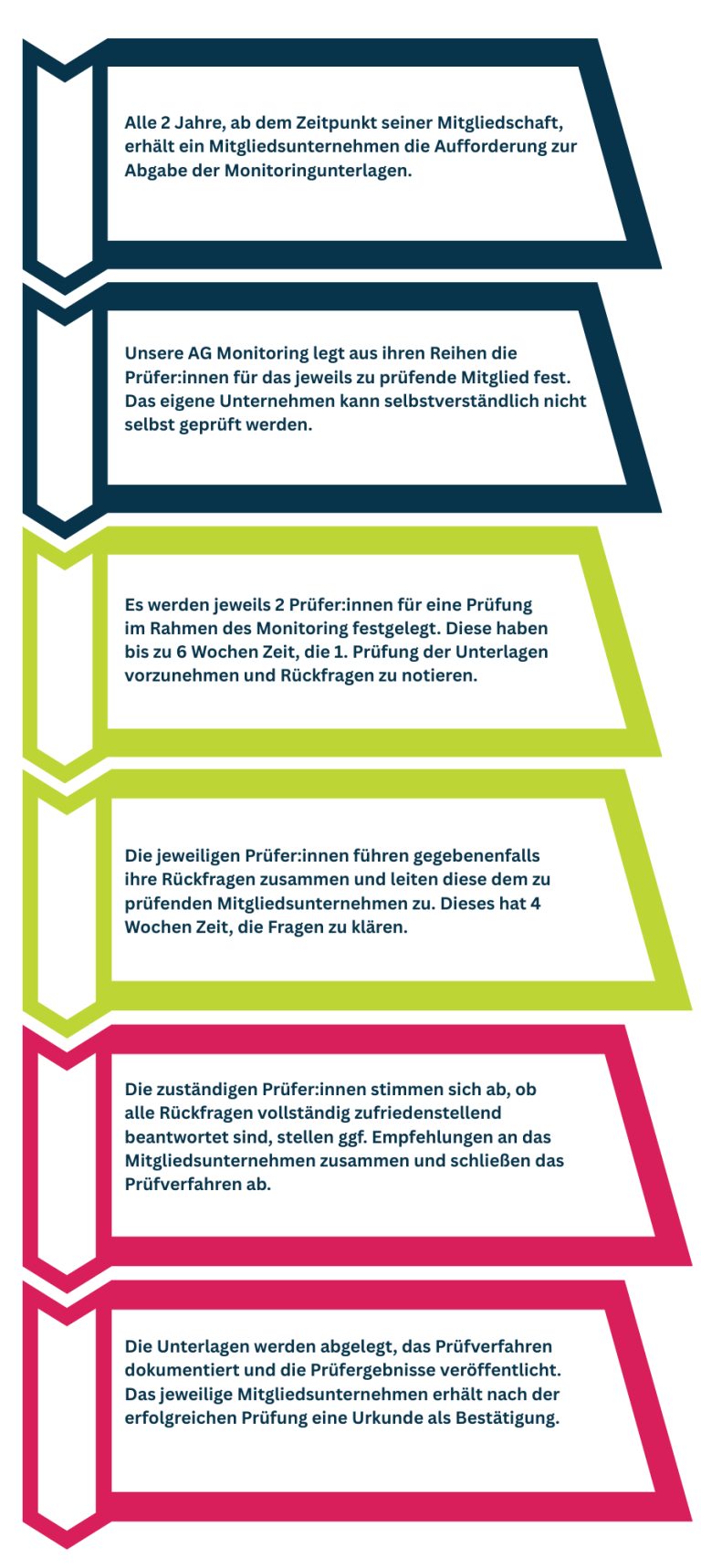 Um dies überprüfbar zumachen und unseren Mitgliedern eine Vergleichsmöglichkeit zu bieten haben wir neben der 1. Prüfung im Bewerbungsprozess ein dauerhaftes Monitoring-System entwickelt. Ziel ist die regelmäßige Überprüfung der Mitglieder anhand der zehn WFTO-Prinzipien des Fairen Handels. Hierfür wird der Peer Review der WFTO als Grundlage herangezogen.